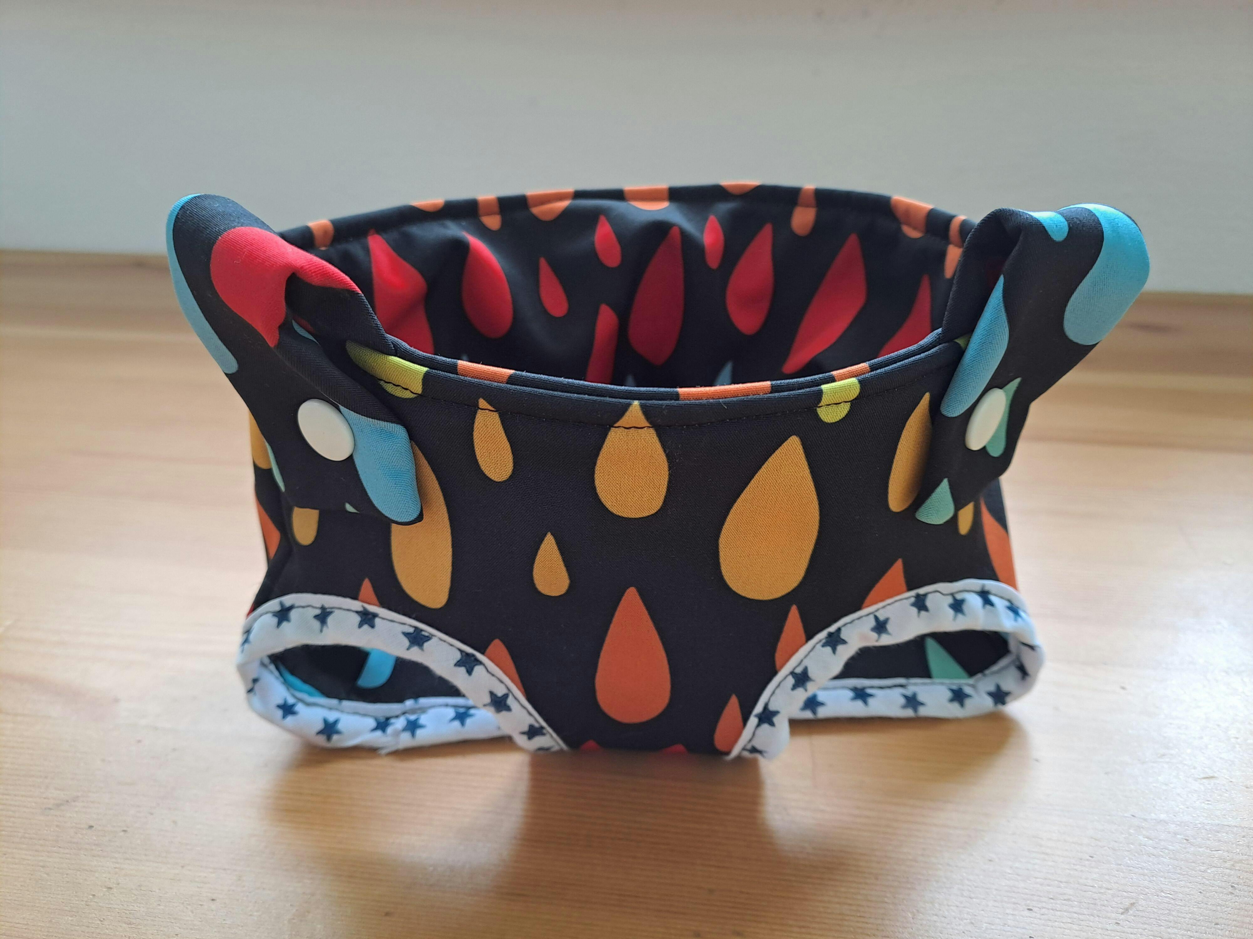 Sehr gute und bebilderte Anleitung. Ich hab auf die Schnelle nach eben so einem Schnittmuster gesucht und bin hier fündig geworden. Das Anbringen des Schrägbandes war allerdings etwas kniffelig und bei zwei Lagen Softshell wollte auch der Druckknopf am Boden nicht so richtig gut halten. Hab dann in die Vlieseinlage ein Loch gemacht, das so groß war wie der Knopf, dann ging es gut.